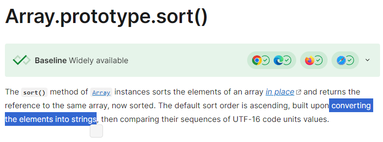 MDN 공식문서에 따르면 배열의 정렬 메소드는 인자들을 문자열로 바꾼 뒤 UTF-16 코드를 오름차순 정렬을 한다고 한다.