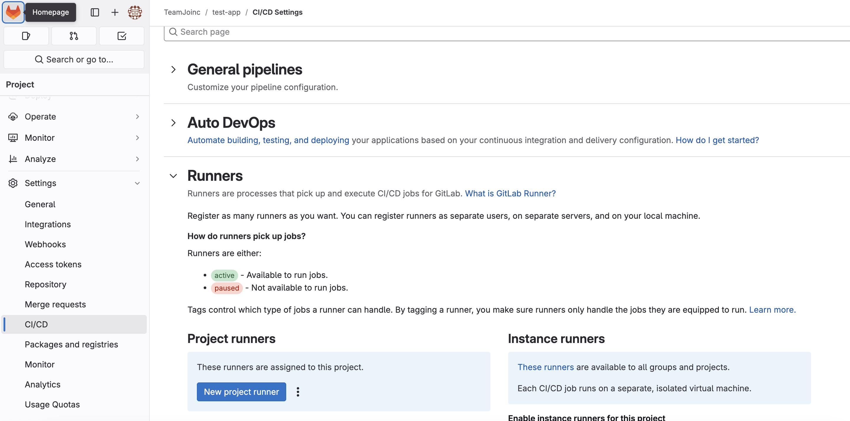 gitlab-runner 적용을 원하는 프로젝트를 클릭해 들어간 후, 왼쪽 메뉴에서 Settings -> CI/CD를 클릭한다.