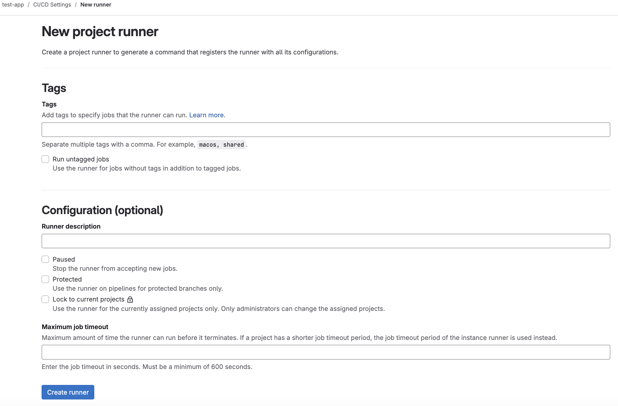 첫 번째 체크박스인 Run untagged jobs만 체크하고 Create runner 버튼을 클릭한다.