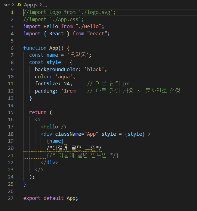 위에서 만든 Hello컴포넌트를 사용하기 위해서는 App.js에 import Hello from './Hello'; 와 React를 추가해야 한다.