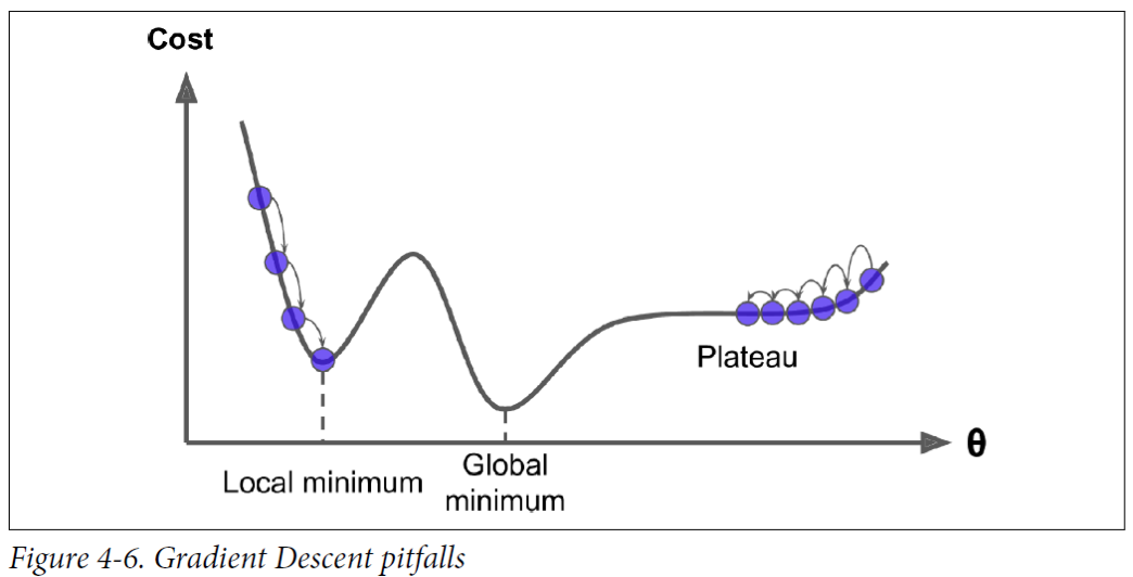 만약 코스트 펑션이 holes(구멍), ridges(산등성), plateaus(고원, flat함을 의미)와 같은 지역이 있으면 미니멈에 도달하기가 쉽지 않음.